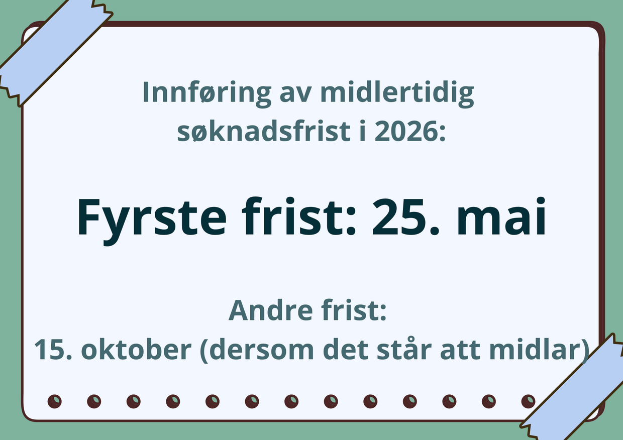 Fyrste søknadsfrist er sett til 25. mai. Andre søknadsfrist blir 15. oktober dersom det framleis står att midlar til da.